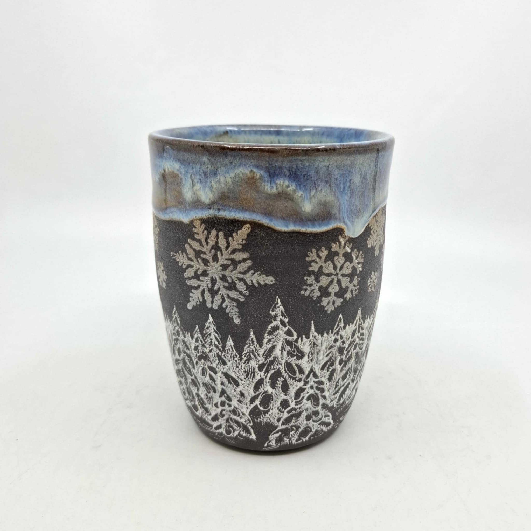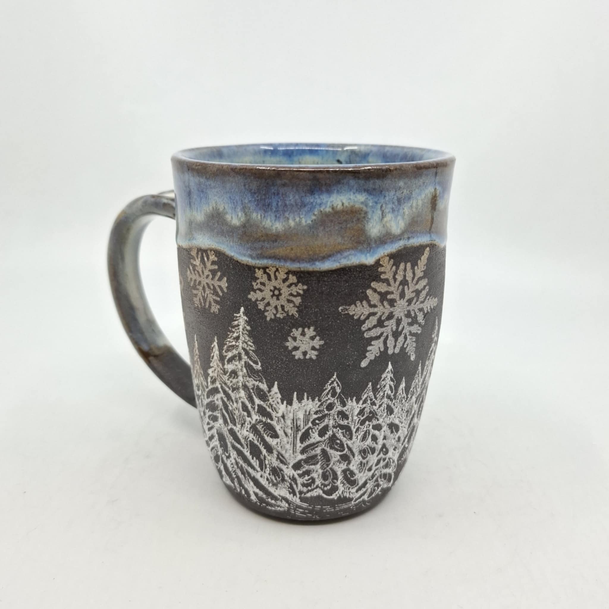 Potikedral mustast savist treitud kruus, mis mahutab 450 ml, kõrgus 11,8 cm. Kruus on valminud käsitööna, võib esineda ebatasasusi, konarusi jms.