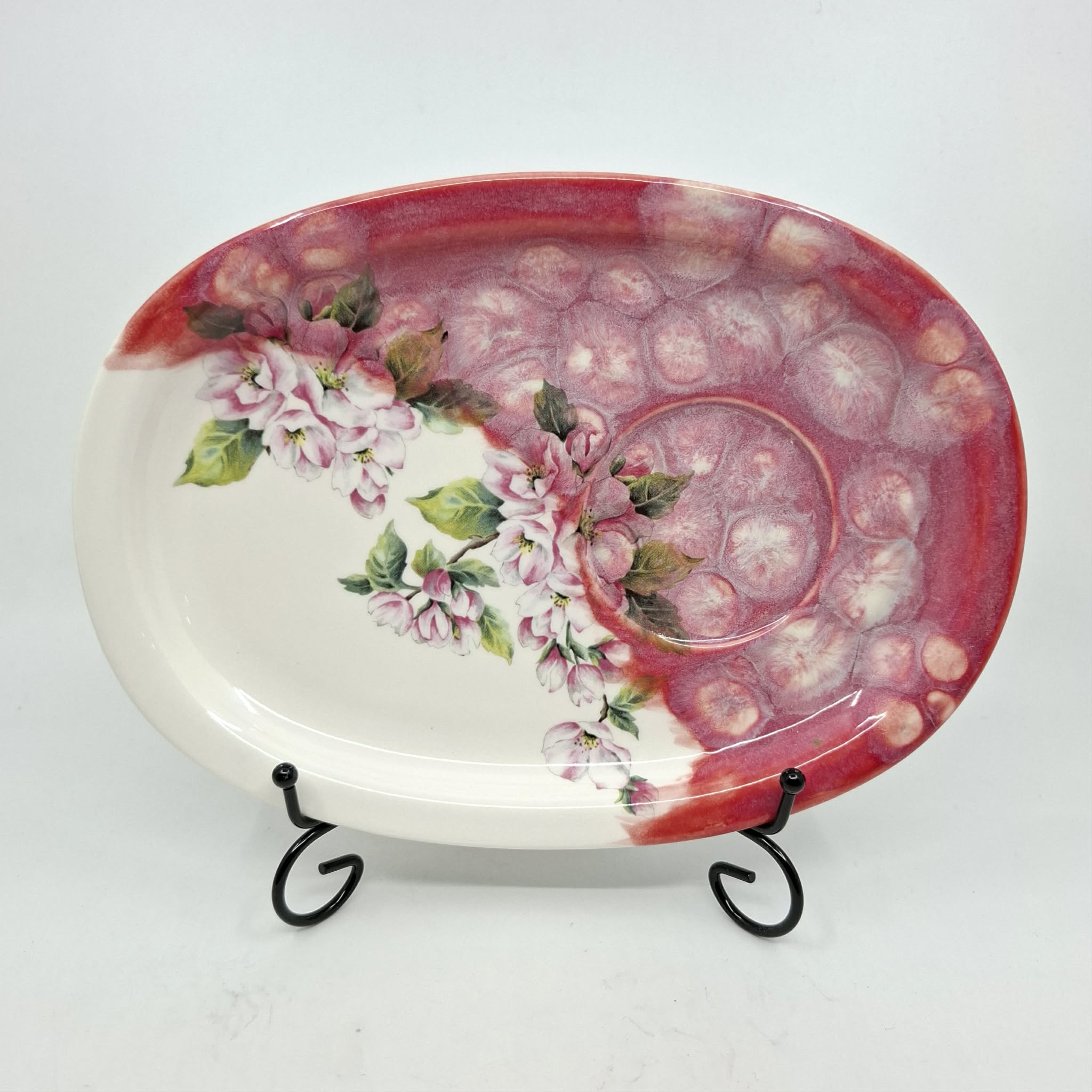 Portselanist taldrik “Õunapuuõied”, millel on kruusi jaoks süvend, suurusega 18,3 x 25,5 cm. Taldrik on valminud käsitööna ja võib esineda konarusi vms.