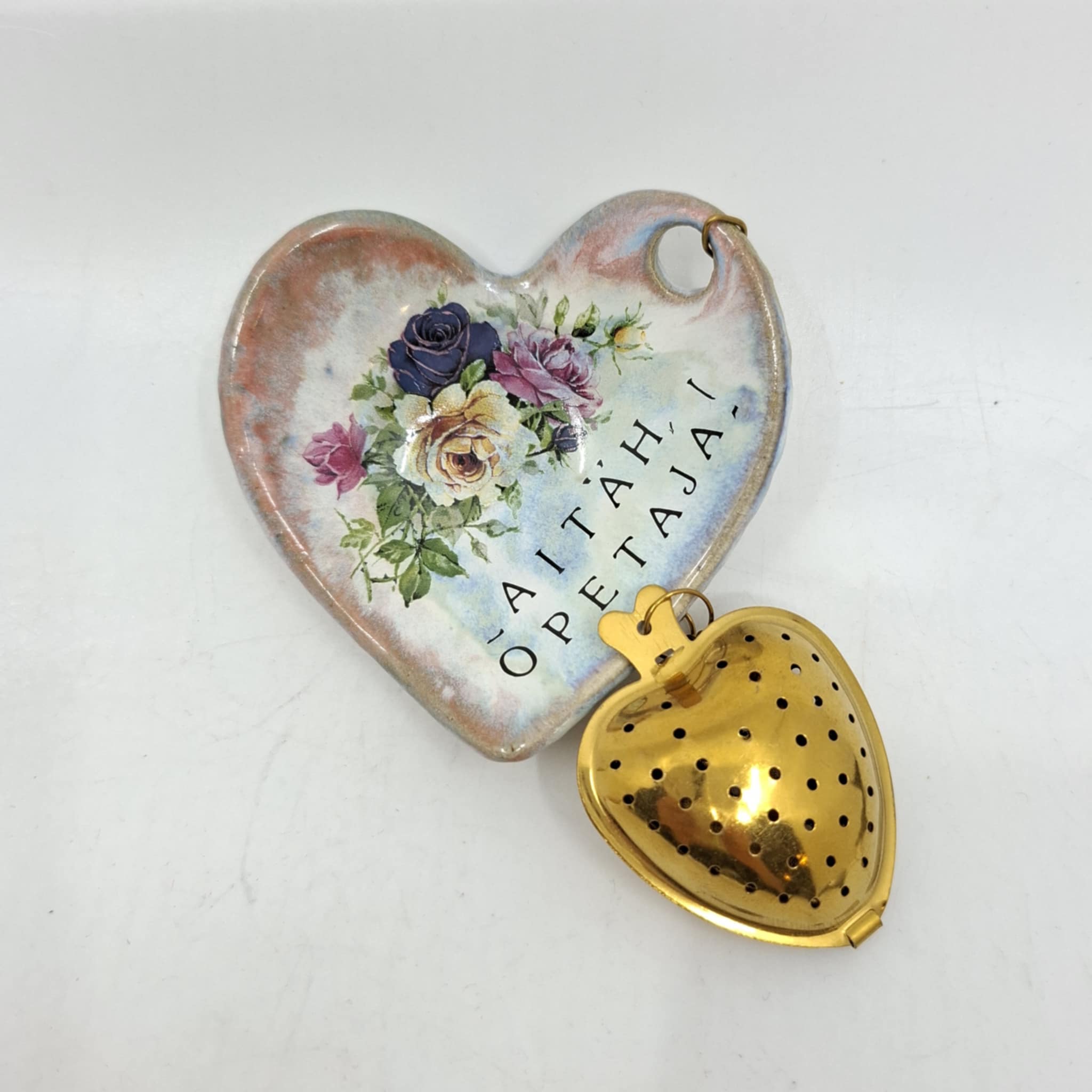 Teesõel alusega, kuhu on mugav pärast teepuru tõmbamist märga konteinerit asetada. Alus on valminud käsitööna ja võib esineda konarusi vms.