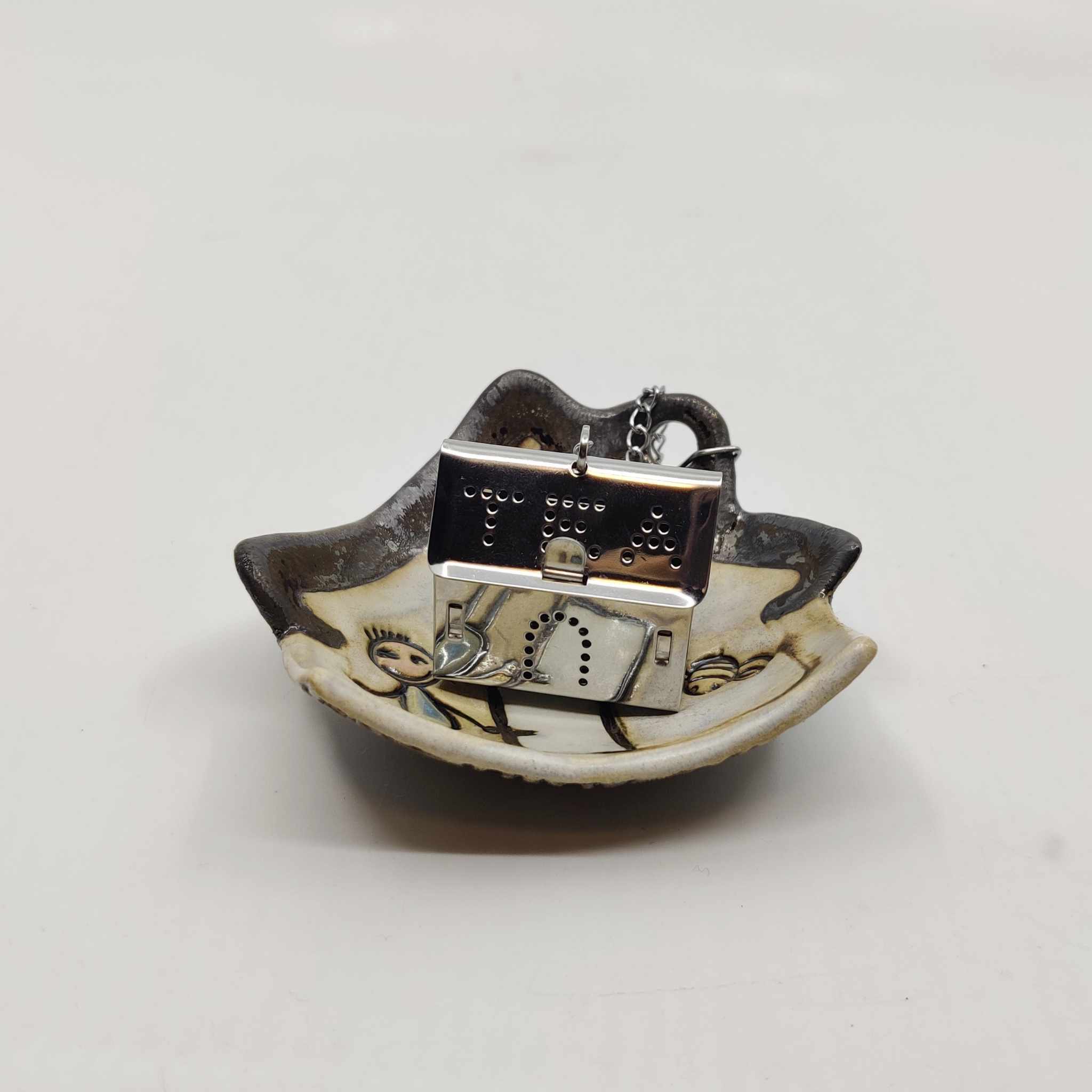 Teesõel alusega, kuhu on mugav pärast teepuru tõmbamist märga konteinerit asetada. Alus on valminud käsitööna ja võib esineda konarusi vms.