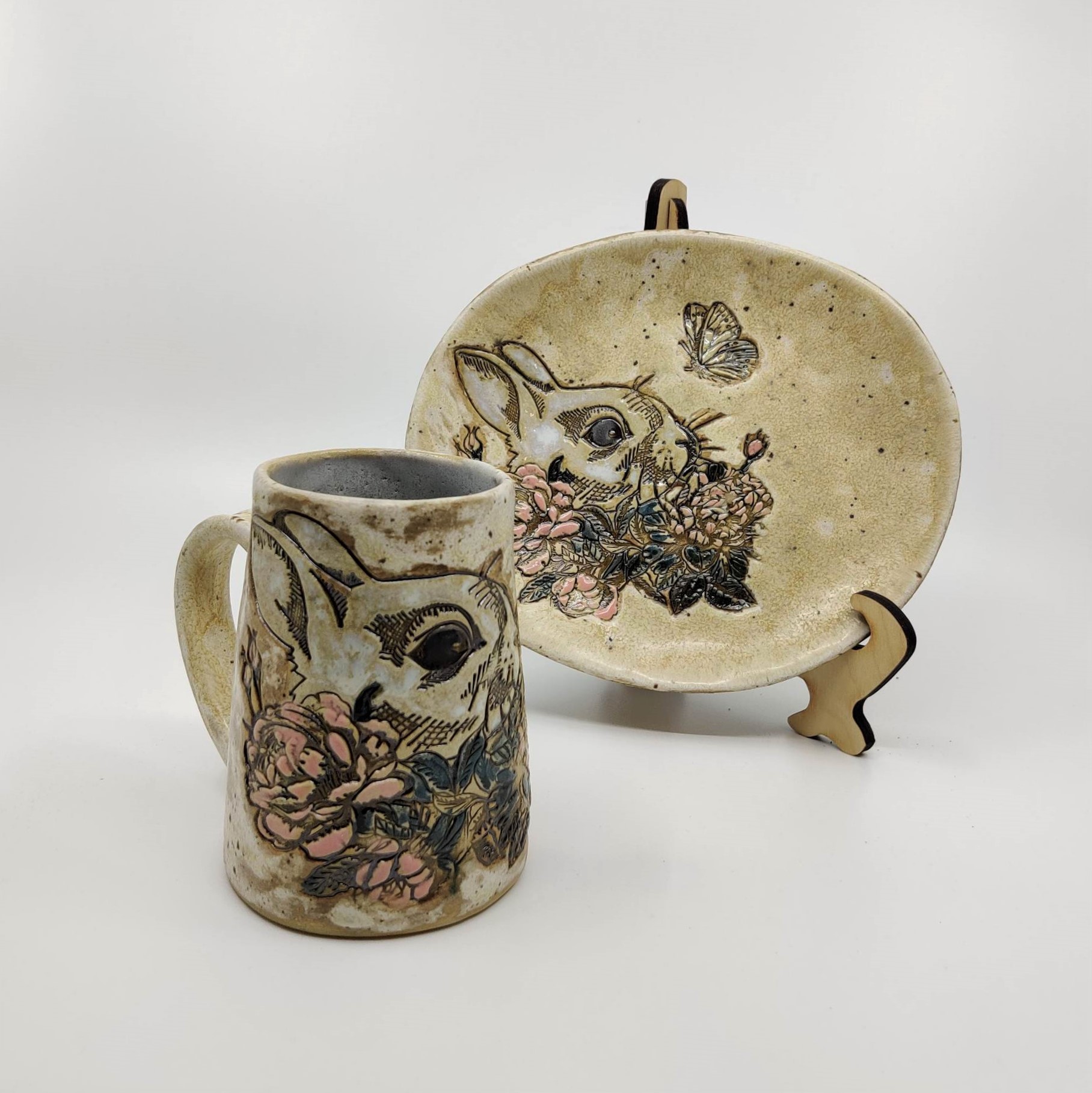 Sildid: jänes, keraamika, komplekt, kõrgkuumus, kruus, lastele, pojengid, taldrik
