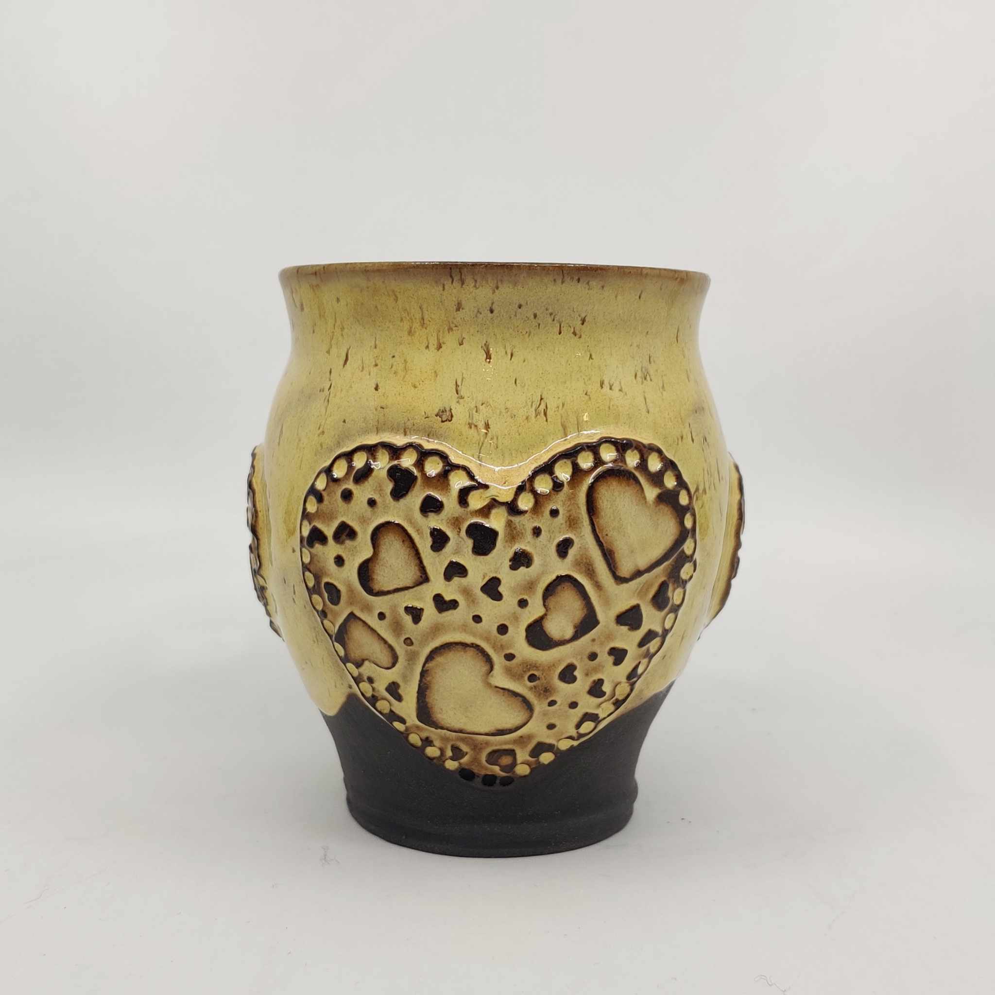 Potikedral mustast savist treitud kruus, mis mahutab 500 ml, kõrgus 11,5 cm. Kruus on valminud käsitööna, võib esineda ebatasasusi, konarusi jms.