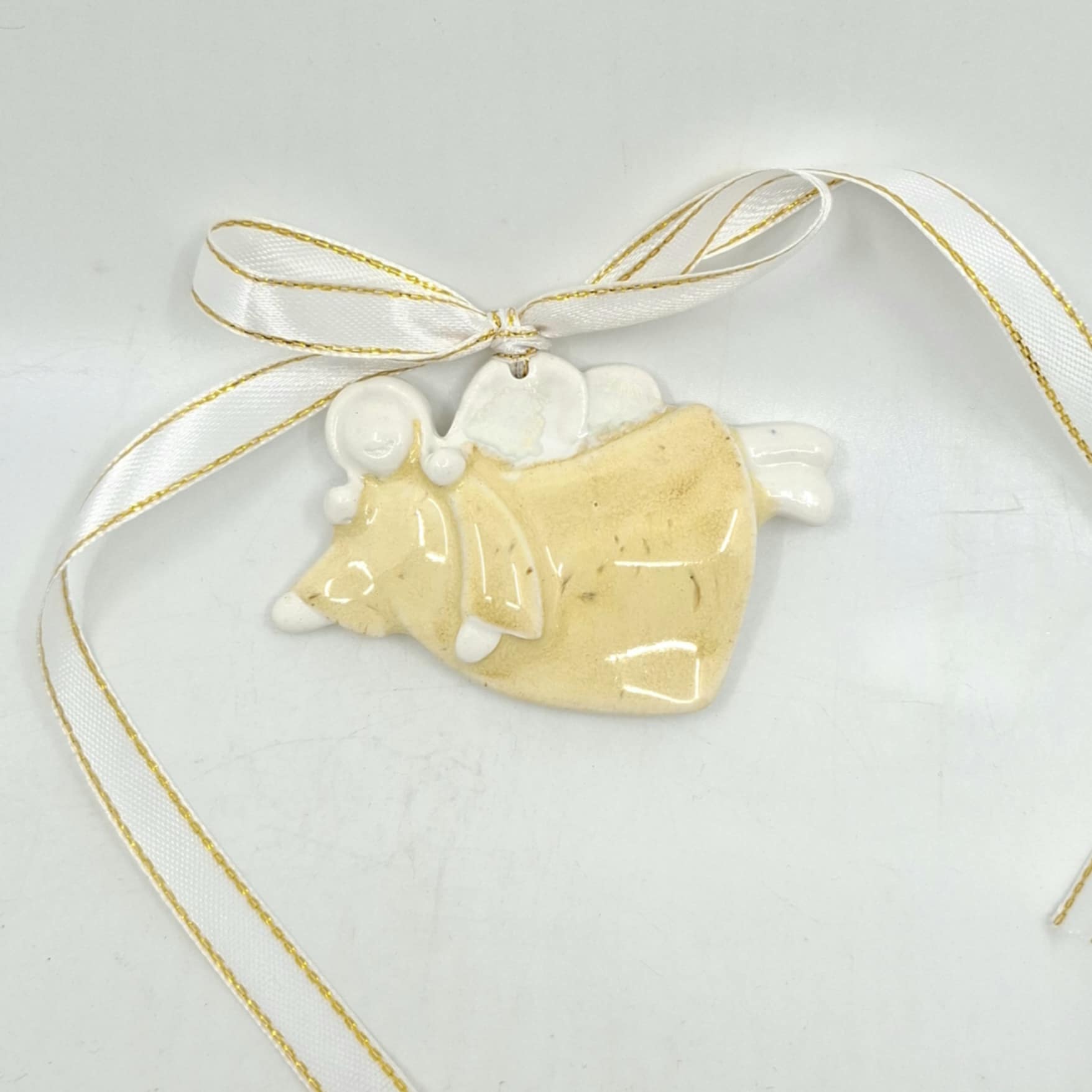 Riputatav portselanist ingel, mille läbimõõt on 8 * 5 cm. Ingli tagumine osa on valge ja sinna on võimalik kirjutada nimi või tervitus või head soovid vms.