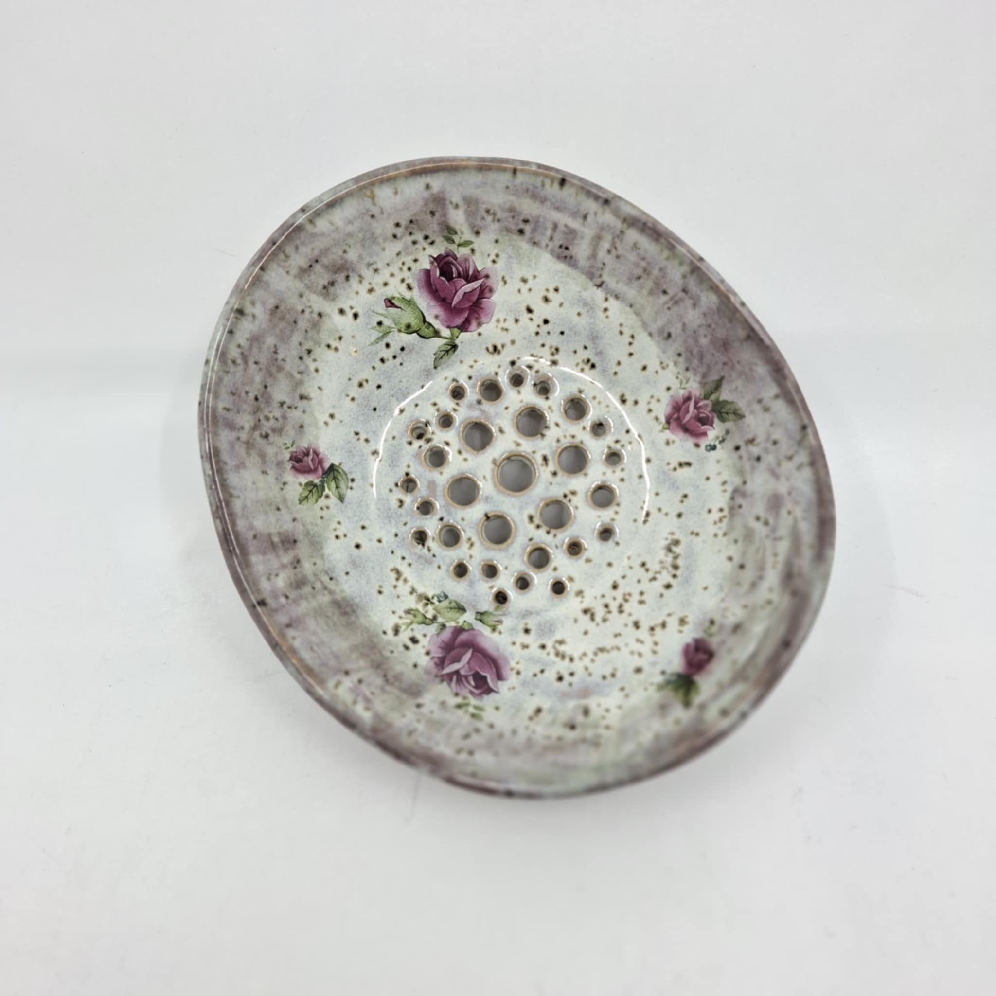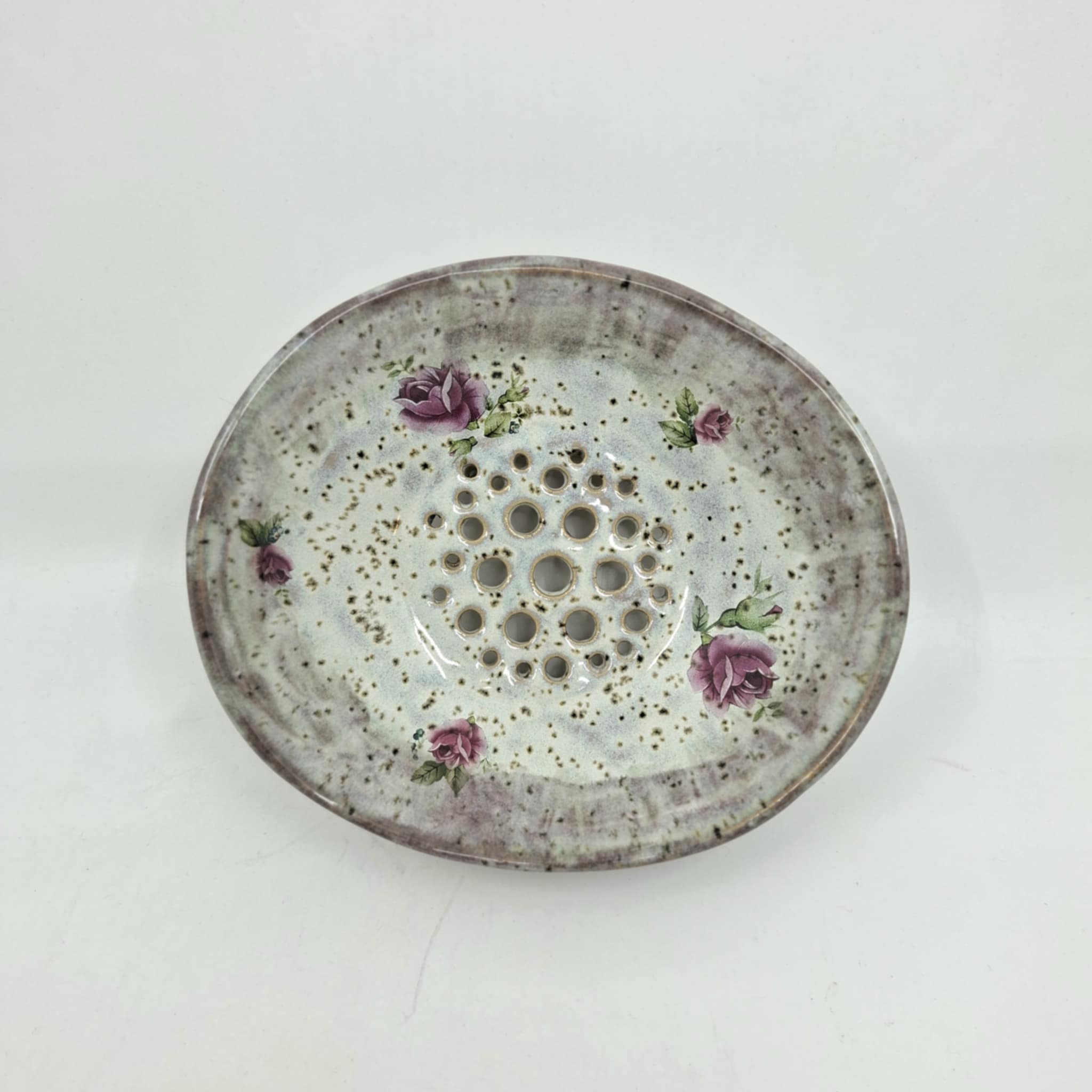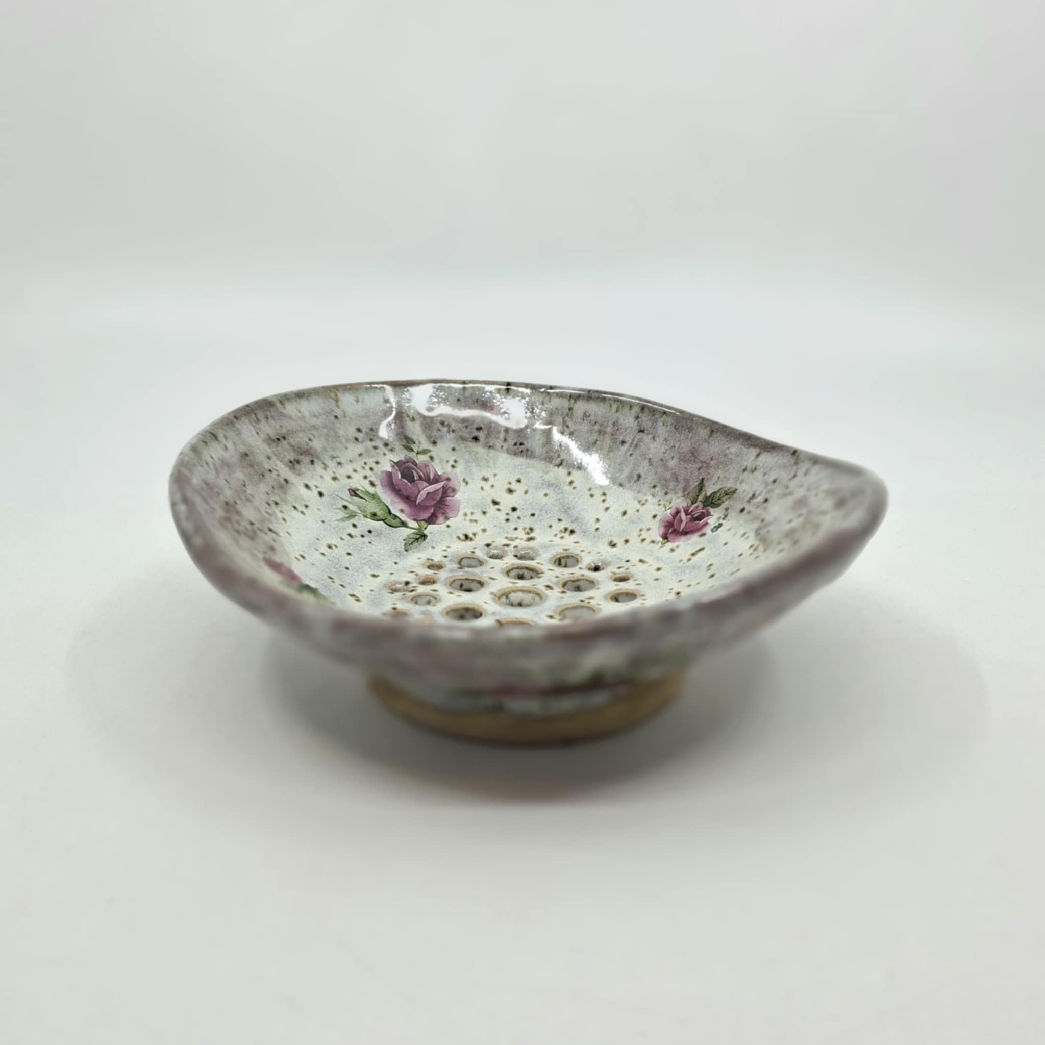Jalaga seebialus või väike nõrutusnõu 13,5 x 15 cm, kõrgus 5,5 cm. Seebialus on valminud käsitööna ning võib esineda ebatasasusi, konarusi jms.